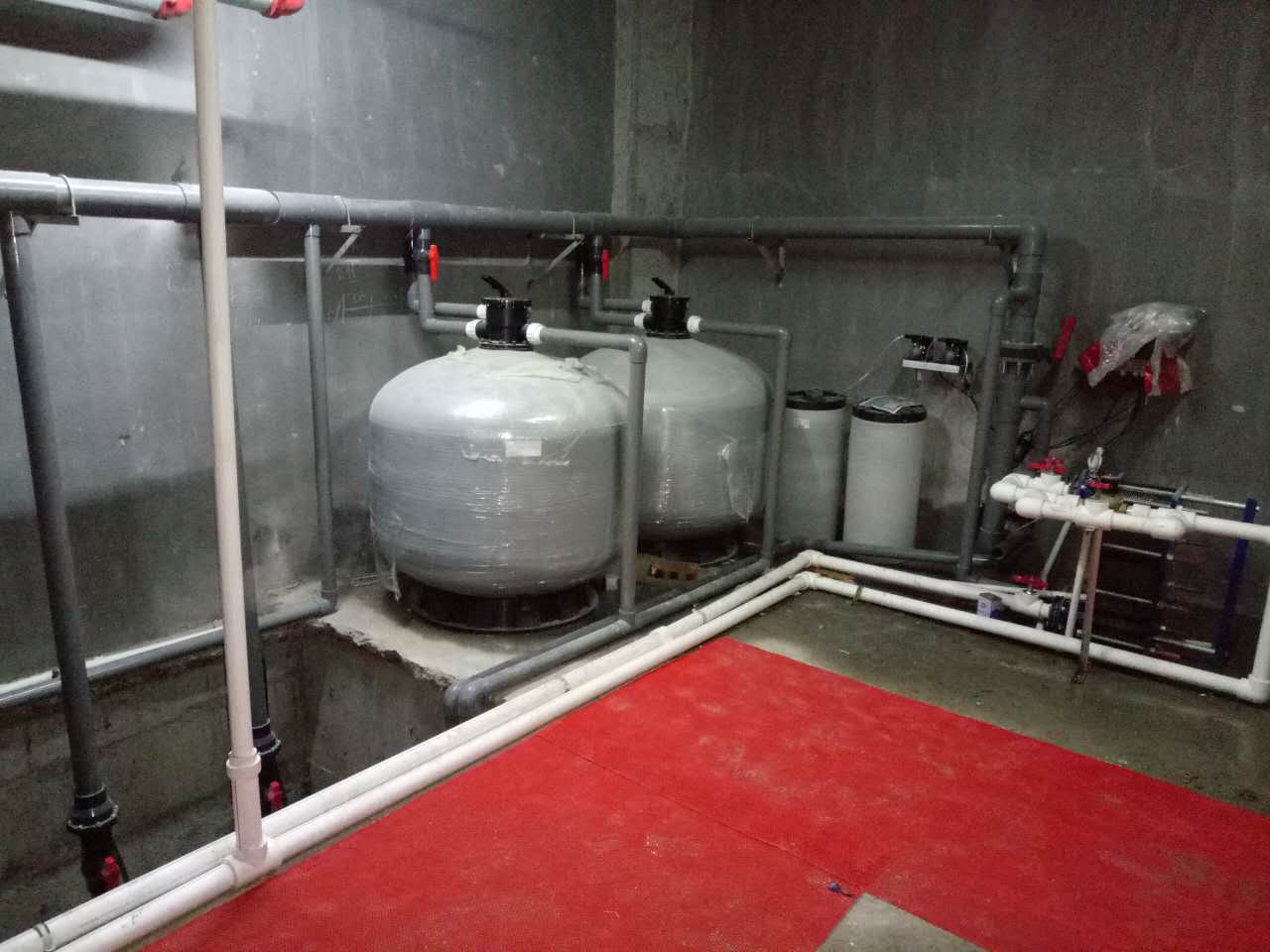 該游泳池水量為350立方米,循環(huán)水系統(tǒng)采用西班牙亞士圖沙缸、意大利科沛達循環(huán)泵、美國西科水質(zhì)監(jiān)測儀、美國藍白投藥泵系統(tǒng),泳池加熱及淋浴熱水采用三溫暖燃氣熱水器,使用簡單方便,且節(jié)能效果良好。
